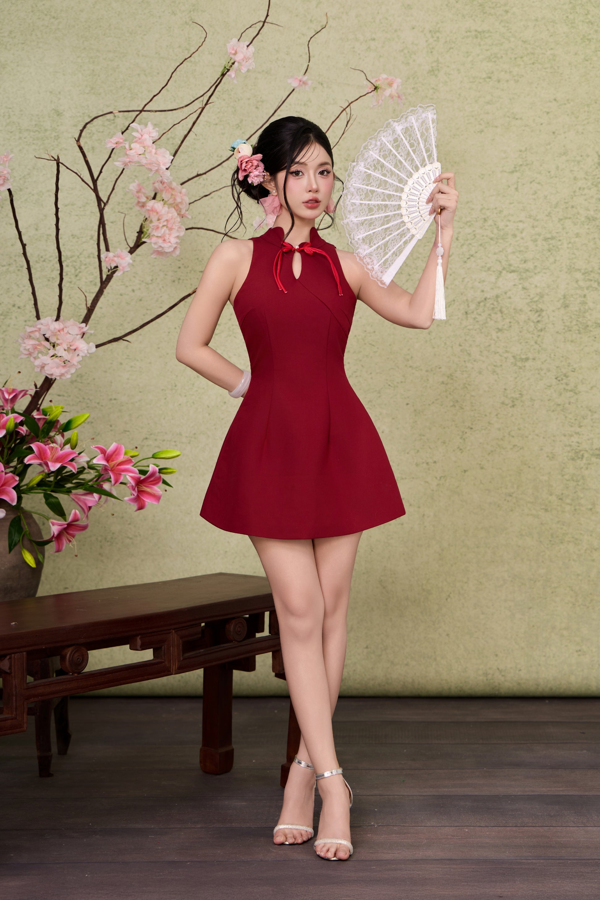Petal Cheongsam Dress - Plain Maroon